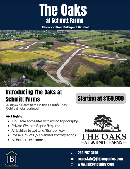 Discover the opportunity to build your dream home in The Oaks at Schmitt Farms, a thoughtfully planned residential subdivision in the heart of Richfield, Wisconsin. Rooted in local history, this land was once home to the Oliver J. Schmitt family farm, a place of hard work, tradition, and community—now transformed into a neighborhood where new memories will be made.